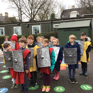 To finish the morning, the year 3s transformed into Roman soldiers. They were taught how to march properly with discipline listening to Latin instructions in three separate groups: Ruber (red), Caelum (blue) and Croceus (yellow). They were then given shields to practise the following Roman shield formations: the Testudo, the Orb and the Wedge.